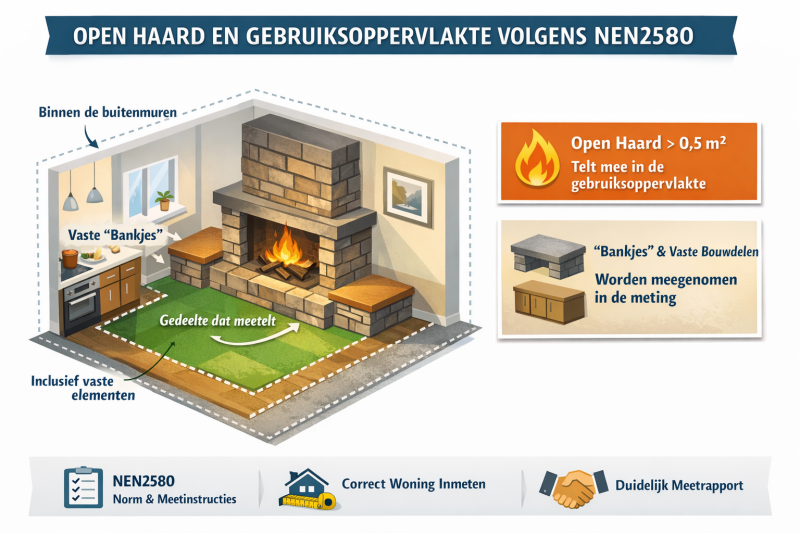 Bij het woning inmeten volgens de NEN2580 telt de oppervlakte van een open haard gewoon mee in de gebruiksoppervlakte. Hetzelfde geldt voor vaste, gemetselde bankjes of andere bouwkundige elementen binnen de gemeten contour.